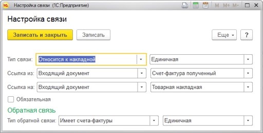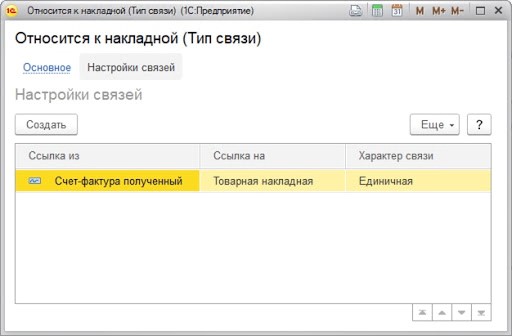 В данной форме указывается тип связи, в нашем случае видно, что она «Относится к накладной». Также можно заметить, что связь единичная и можно найти конкретный вид данного документа. В нашем случае это входящий документ «Счет-фактура полученный».