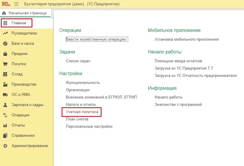 В данном материале мы рассмотрим способ точной настройки учетной политики. Сфера применения - бухгалтерский учет, методология и способы его ведения. Работу по настройке начнем на вкладке раздела «Главное» опция «Учётная политика».