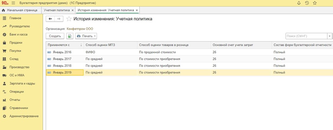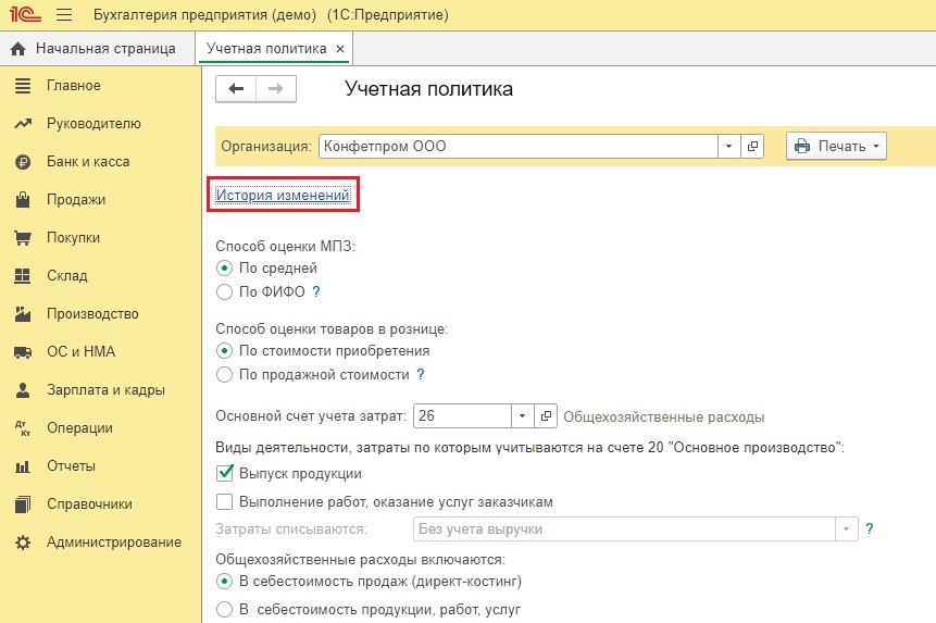 Разработчики настоятельно рекомендуют каждый календарный год начинать с создания новой записи об учетной политике. Это необходимое условие для того, чтобы верно отображались текущие данные в свете изменений действующего законодательства. Дополнительно можно отправлять на печать внутренние приказы и положения, касающиеся учетной политики. Эти приказы будут содержать точную ссылку на законы, что очень удобно. Такие же операции можно проделывать с планом счетов и учетными регистрами. На текущей странице есть активная опция «История изменений», которая дает доступ к истории изменений учетной политики в предыдущие периоды.
