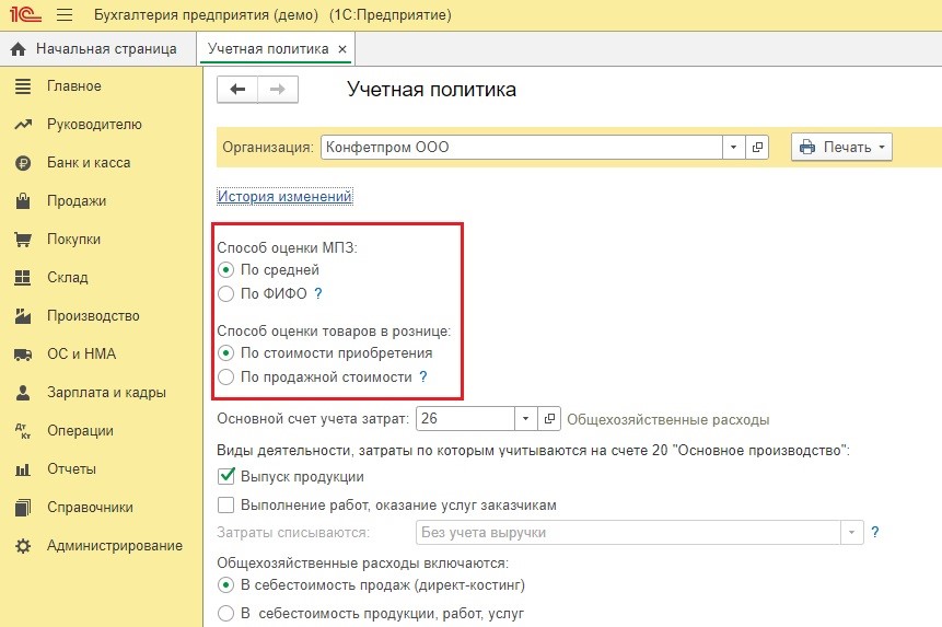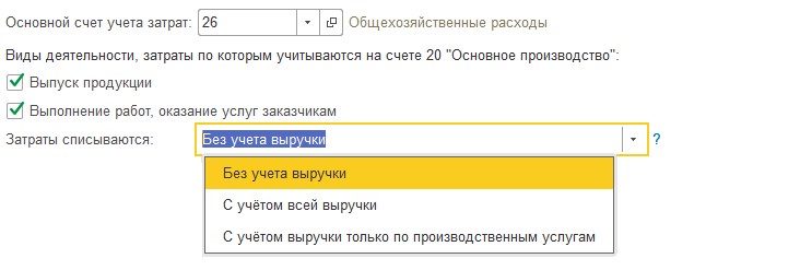 Если деятельность вашей компании связана с производством или услугами, то соответствующие опции необходимо активировать с помощью галочки. Затем необходимо выбрать один из способов списания затрат.