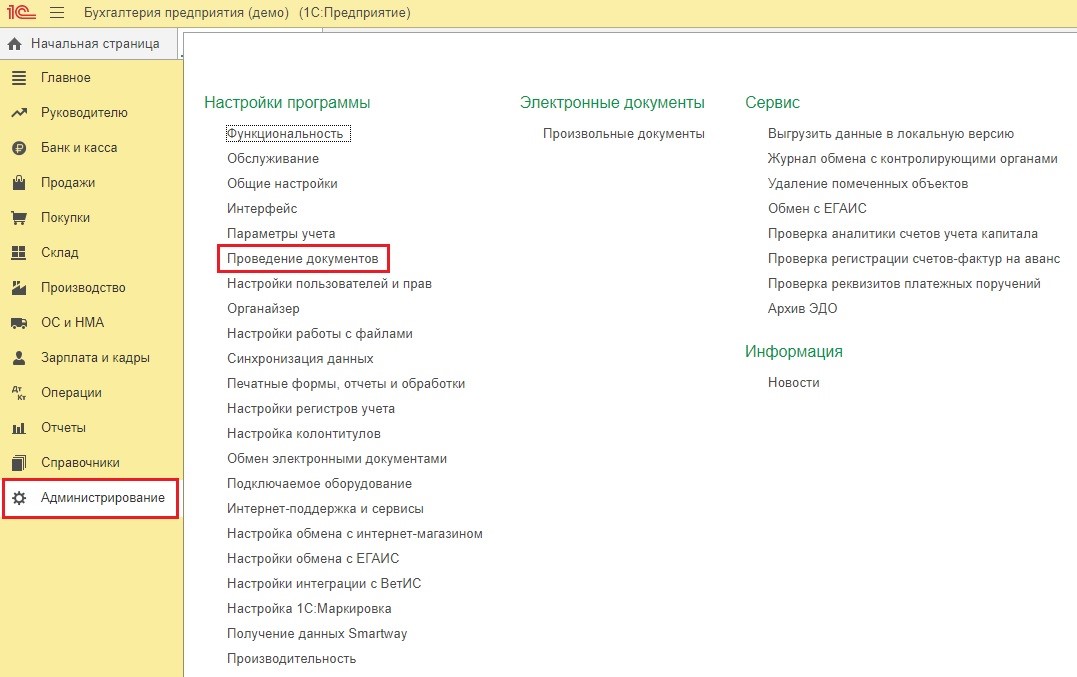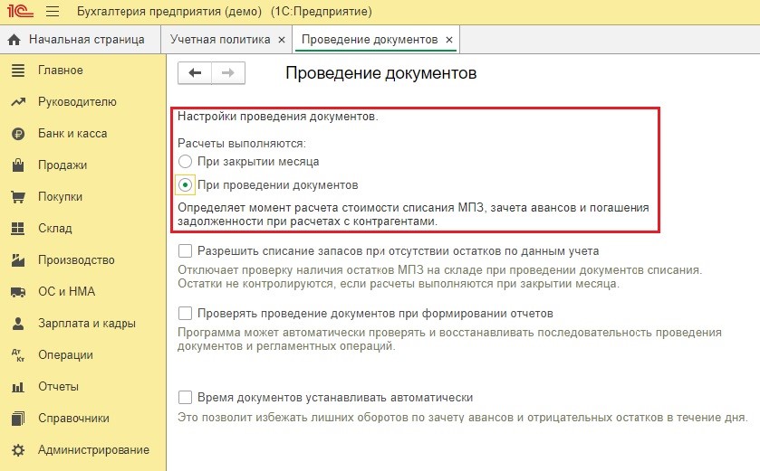Для того, чтобы активировать нужный метод расчета, пользователь должен во вкладке «Администрирование» перейти к опции «Проведение документов» и активировать пункт «Расчёты выполняются».