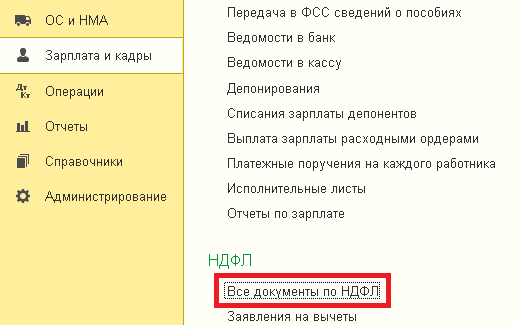 Данные в отчете по НДФЛ отражаются в форме «Операция учета НДФЛ». Она находится в разделе «Зарплата и кадры», затем «Все документы по НДФЛ».