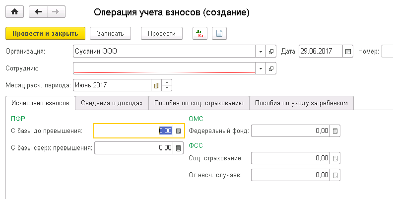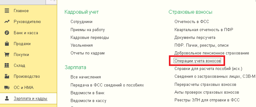 Когда данный вид дохода облагается взносами, то нужно во вкладке  «Зарплата и кадры» создать документ «Операция учета взносов».