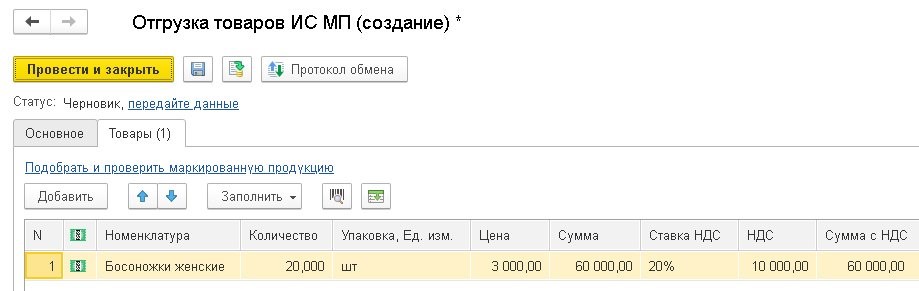 Если пользователь не будет использовать возможность электронного документооборота, он должен создавать документ "Отгрузка товаров ИС МП" по имеющейся ссылке. В документе нет корреспонденции бухгалтерского учета, поскольку его назначение - передавать маркировочные коды в "Честный знак".