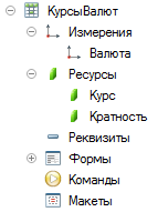 Список регистров сведений доступен в развернутом пункте «Регистры сведений» Конфигуратора.