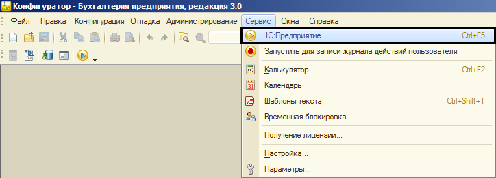 Затем выбираем вкладку «Сервис» - «1С:Предприятие».
