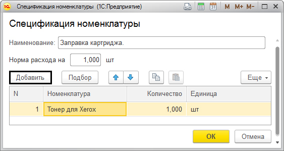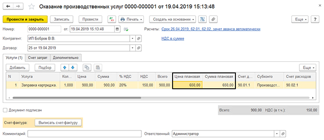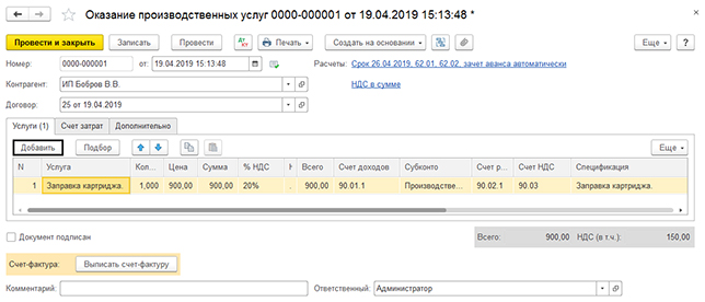 Разберем обычный пример. Допустим компания предоставила услугу – заправила картридж. Заполняем шапку, прописываем поле "Контрагент", "Договор", нажимаем "Добавить" и смотрим табличную часть.