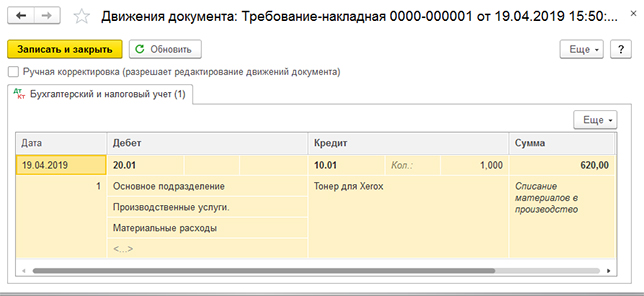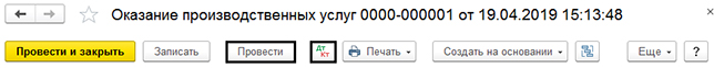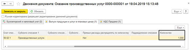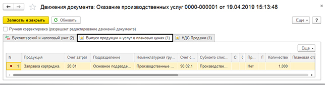 Давайте посмотрим вкладку "Счет затрат". Там нужно заполнить все поля для того, чтобы сформировать бухгалтерские записи при списывании затрат по этой услуге. Использованная для учета производства номенклатурная группа, не должна быть в других видах деятельности (реализация или выпуск товаров и тому подобное). Далее нужно нажать на "Провести" и проверить проводки, для этого жмем кнопку "Дт/Кт".