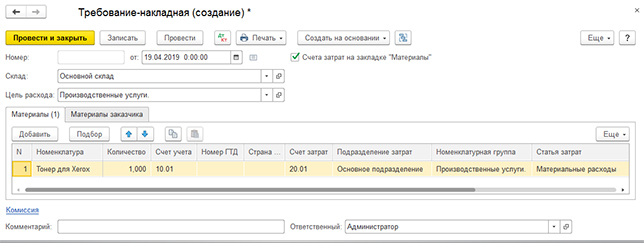 Создаем "Требование - накладную»", как на рисунке выше. В документ в автоматическом порядке перенесены данные спецификации. Поэтому нужно только заполнить склад, откуда производится списывание расходников. Указываем цель расхода, как в примере - "Производственные услуги".
