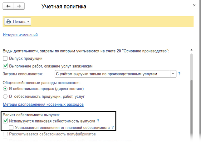 Находим строку - "расчет себестоимости выпуска". При установке галочки "использовать плановую себестоимость", оказание услуги целый месяц учитываются по плановой, а в конце по фактической себестоимости.