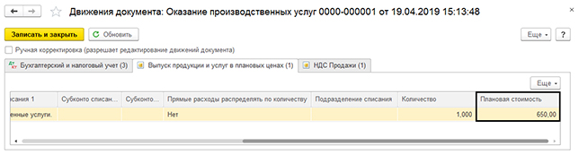 Проводим документ и смотрим какие записи сформированы. Можно увидеть, что кроме проводки отражения выручки от реализации услуги, отражаются и расходы плановой себестоимости, которая была нами указана. Помимо бухгалтерских записей формируется запись в регистр о данной услуге в плановых ценах. Там отражается запись по плановой себестоимости.