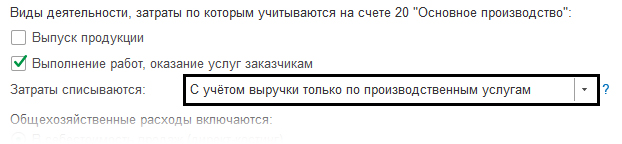 • Если выбрать первое - без учета выручки, то затраты списываются со счета 20 числа "Основное производство". Данный вариант может быть удобен тем, кто не делает учет в отношении номенклатурных групп;