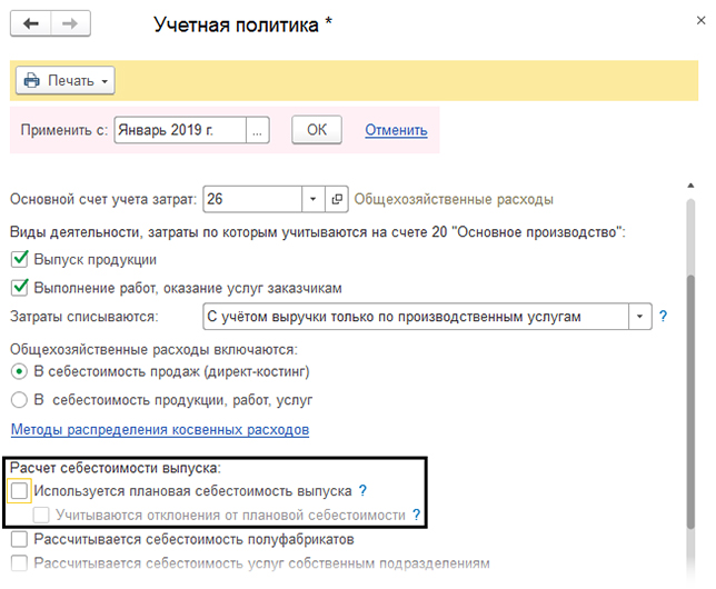 Возвращаемся в главное меню, к настройкам учетной политики. Отмечаем галочкой графу "Используется плановая себестоимость".