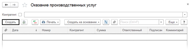 Выбираем в меню "Производство - Выпуск продукции", находим документ "Оказание производственных услуг"