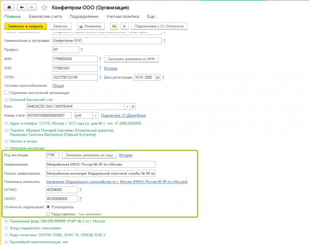 Карточка каждой организации в 1С содержит раздел "Налоговая инспекция", где расположены реквизиты ОКТМО, а также все остальные реквизиты для ИФНС.