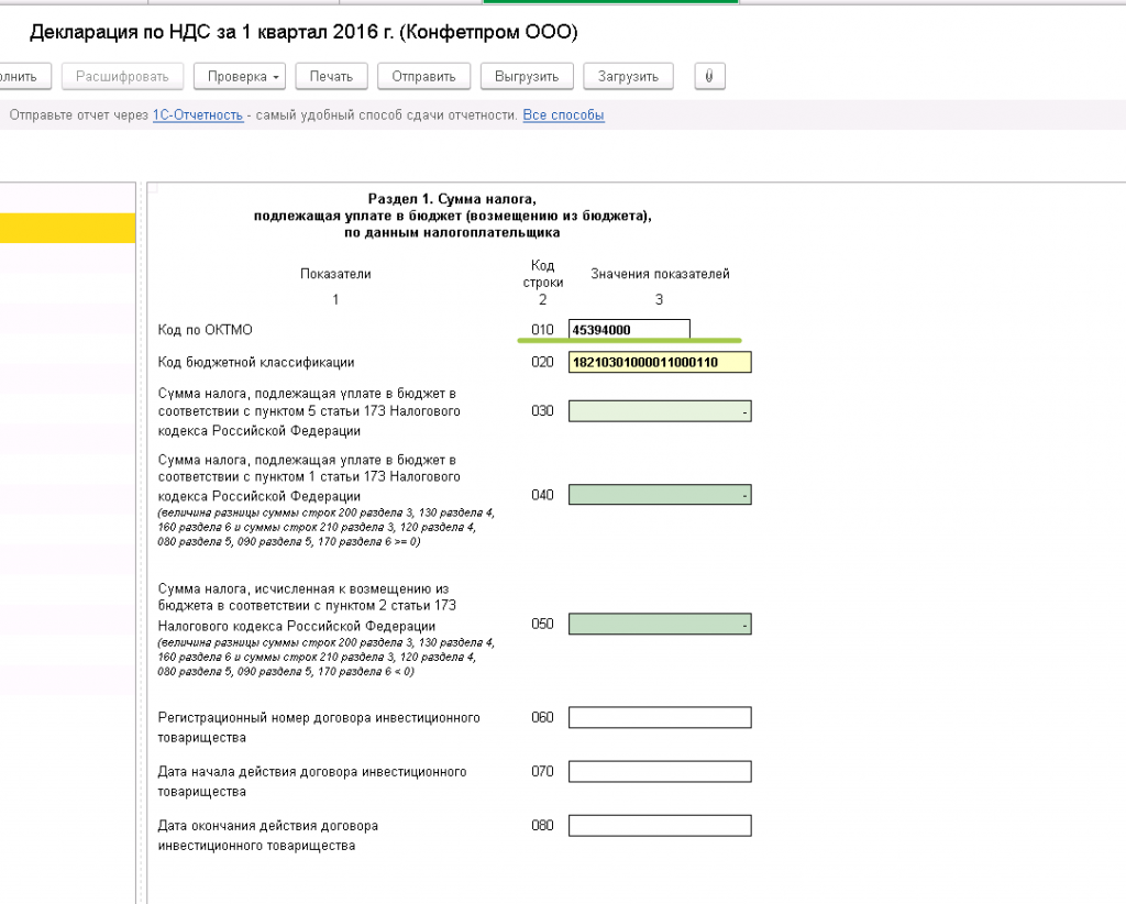 Помимо указания в платежках, ОКТМО также является обязательным реквизитом для регламентированных отчетов. Сюда же относится "Декларация по НДС" (раздел 1)