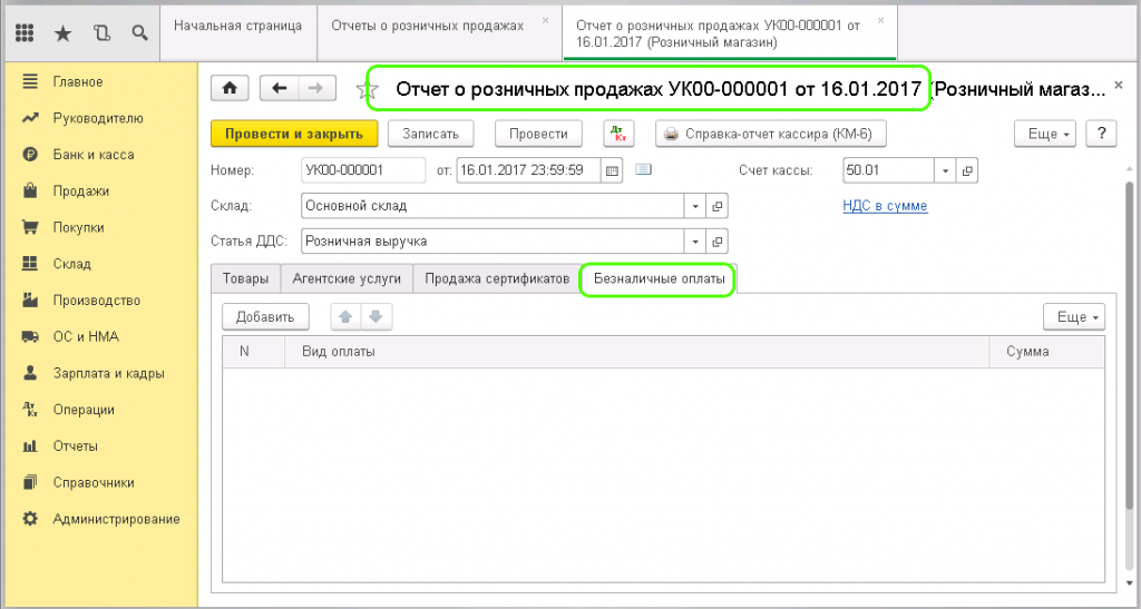В первом случае процесс эквайринга прост: в разделе «Продажи» выберите пункт «Отчёт о розничных продажах». Появится список отчётов, в нём следует выбрать тот, в которому нужно привязать оплату картой – перейдите во вкладку «Безналичные оплаты».