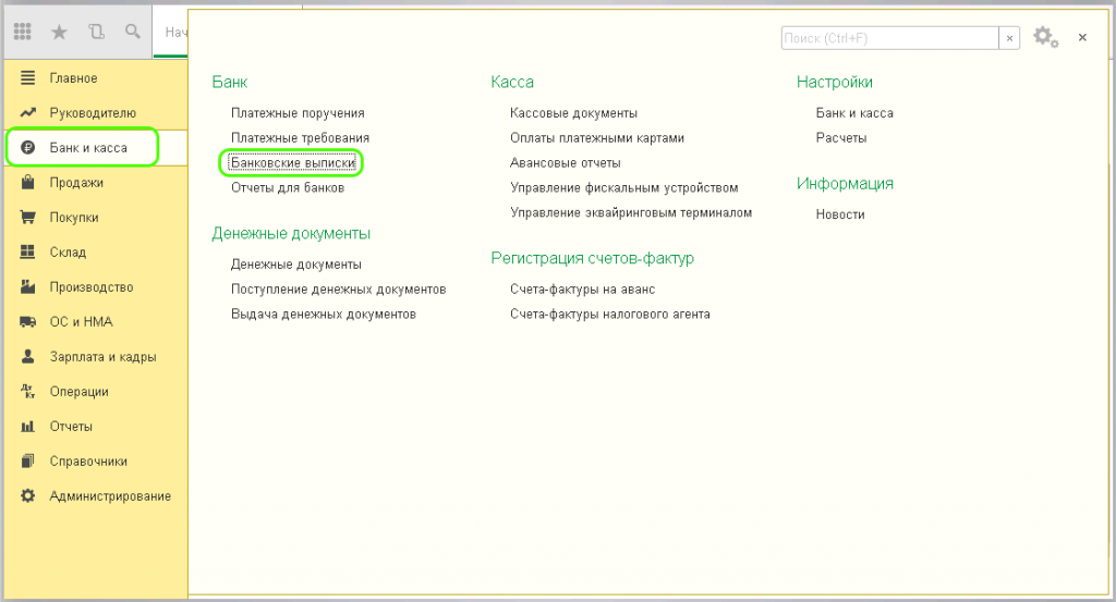 С карты покупателя деньги списаны, ещё не отражено поступление на расчётный счёт. Для этого нужно перейти в раздел «Банк и касса» и найти там пункт «Банковские выписки», как показано на скриншоте: