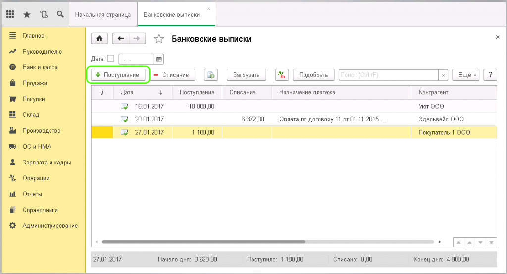 Когда документ будет проведён, нужно загрузить банковскую выписку, показывающую, что средства на расчётный счёт поступили. Введён документ может быть и на основании оплаты картой: