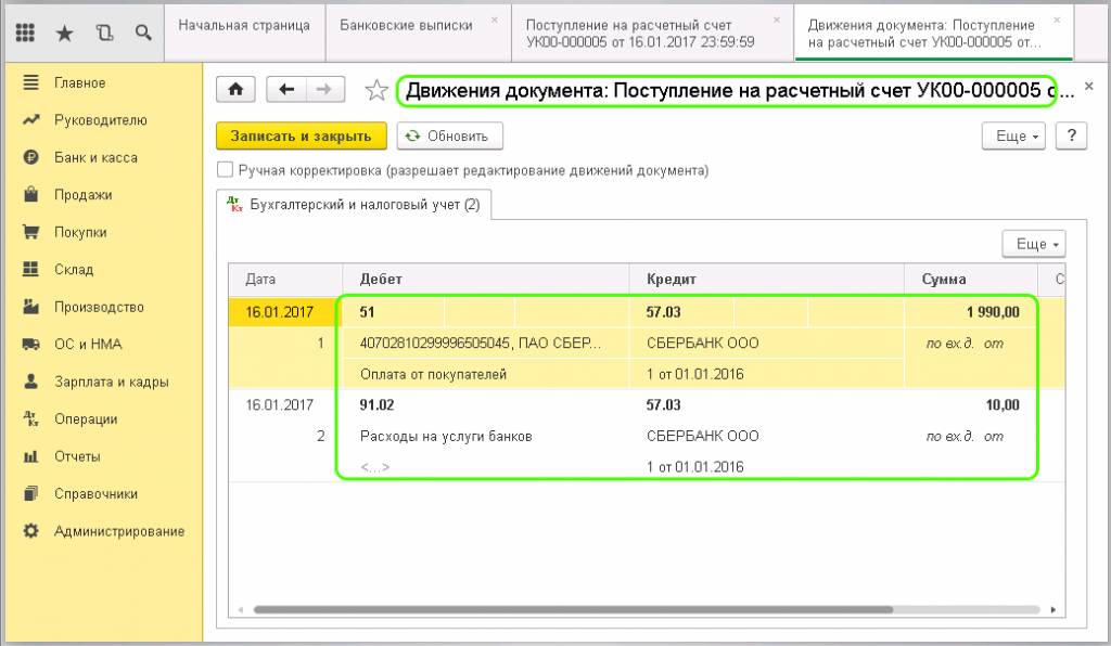 Когда вид оплаты будет создан, нужно указать оплаченную картами сумму и сделать проводку. Созданные проводки должны быть такими: