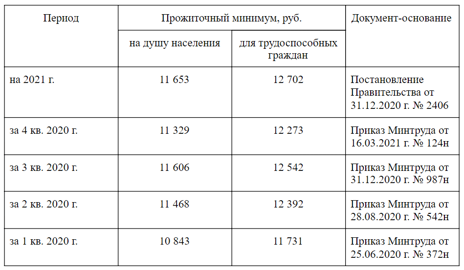 На 2021 г. величина прожиточного минимума регламентирована Постановлением Правительства от 31.12.2020 г. № 2406: