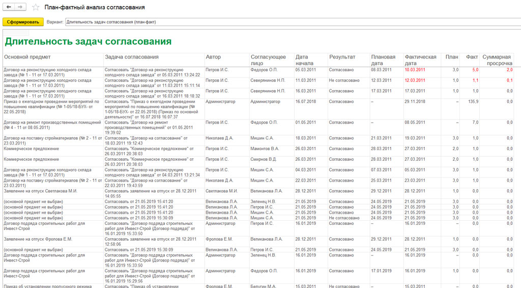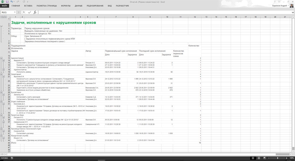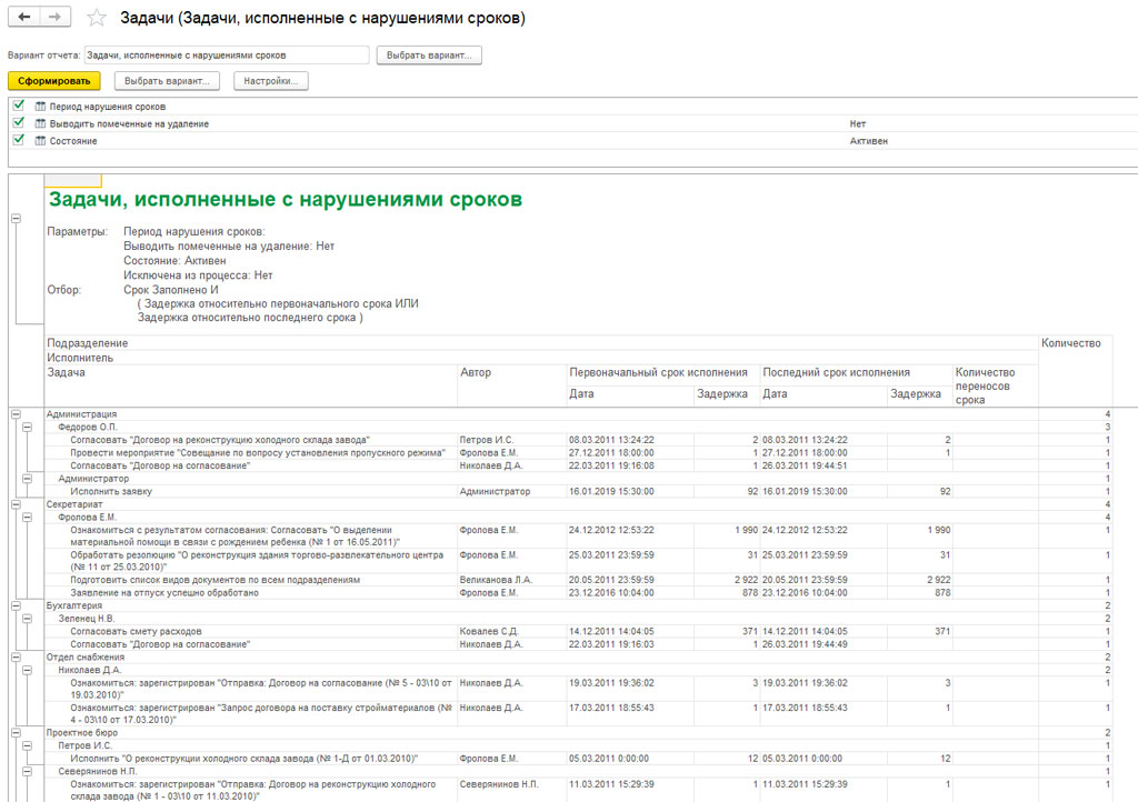 Отчет "задачи, исполненные с нарушенным сроком", позволит руководителю обнаружить недоработанные задачи за некий период.