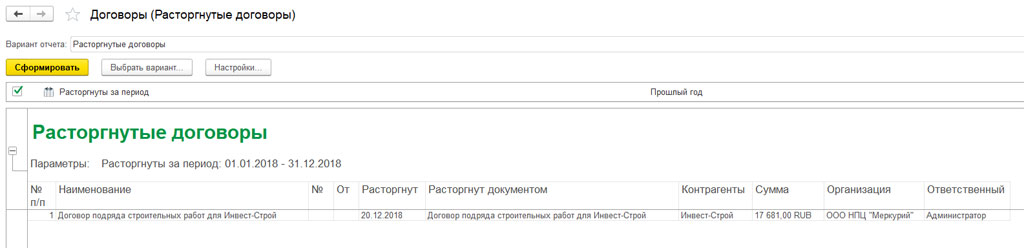 Отчет по управлению договорной деятельности, показывает все актуальные данные по договорам за выбранные период.