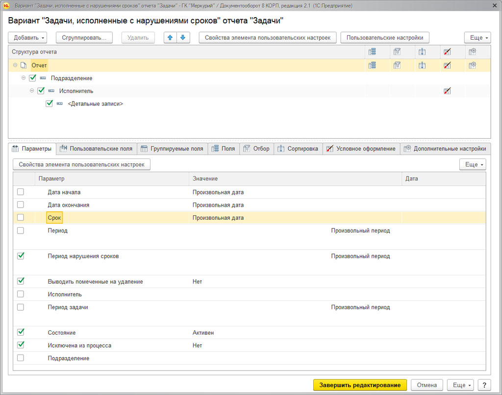 Если у вас есть некие знания при работе с настройками СКД программе 1C:Документооборот, то вы можете сделать полную настройку всего отчета. Чаще всего, такой настройкой занимаются специалисты при внедрении системы.