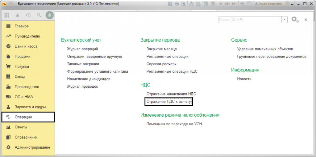 1С:Бухгалтерия предусматривает полную автоматизацию процесса учета НДС. Вместе с тем, нередко, возникает необходимость введения налога в «ручном режиме». В частности, при ведении упрощенки, или когда необходима его аннуляция, корректировка или уточнение. Именно для этого в «Операциях НДС» предусмотрена опция – «Отражение НДС к вычету». Расположение этой опции, представлено на рисунке 1.