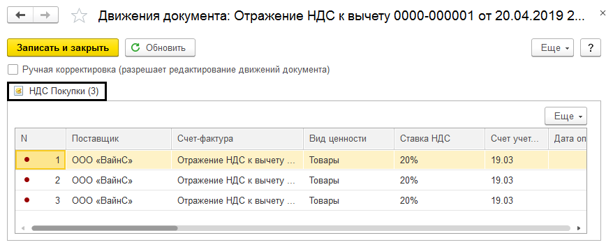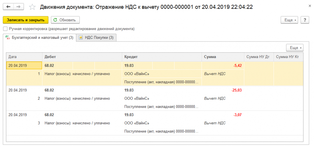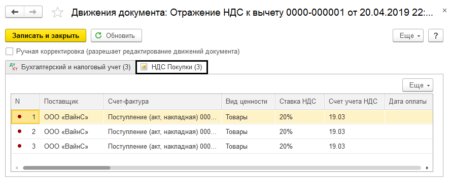В результате, после отражения корректировки, можно увидеть все проводки, сформированные программой. Кроме того, заполнены поля в регистре накопления «НДС покупки».