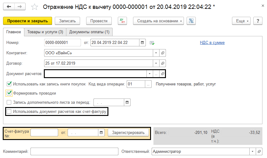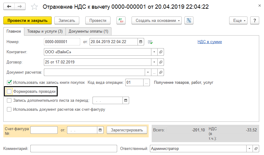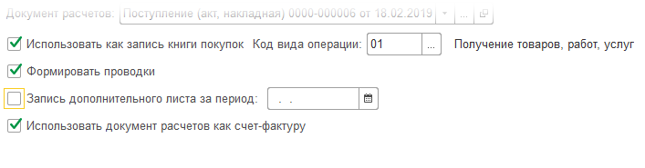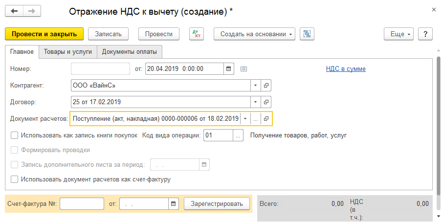• В случае, если позиция «Использовать как запись книги покупок» не будет выбрана, то налог отразиться в позиции «к вычету», аналогично поступающим документам. В такой ситуации, чтобы книга покупок содержала соответствующую запись, необходимо дополнительное введение документа форматирования.