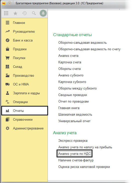 Для этого необходимо зайти в раздел - «Отчетность-Анализ учета-Анализ учета по НДС».