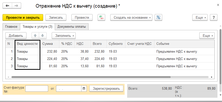 Перечень ценностей будет заполняться автоматически из соответствующего начального документа, где в графе «Вид ценности» отмечается не детализированный вид материальных ценностей. Этого действия вполне хватает для фиксации в книгах покупки.