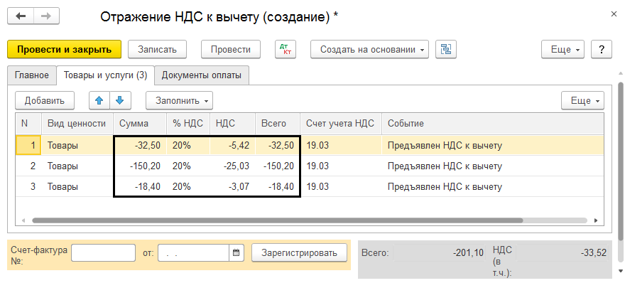 Счет-фактура вводится на основании в ходе отражения налога к вычету, например при отсутствии первичной документации поступления.