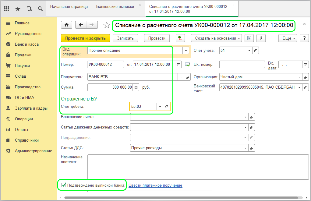 Для регистрации перевода на депозит в программе нужно создать документ «Списание с расчётного счета». Эта операция аналогична обычному банковскому переводу денежных средств (далее – ДС). Документ или оформляется вручную, или загружается из клиент-банка.