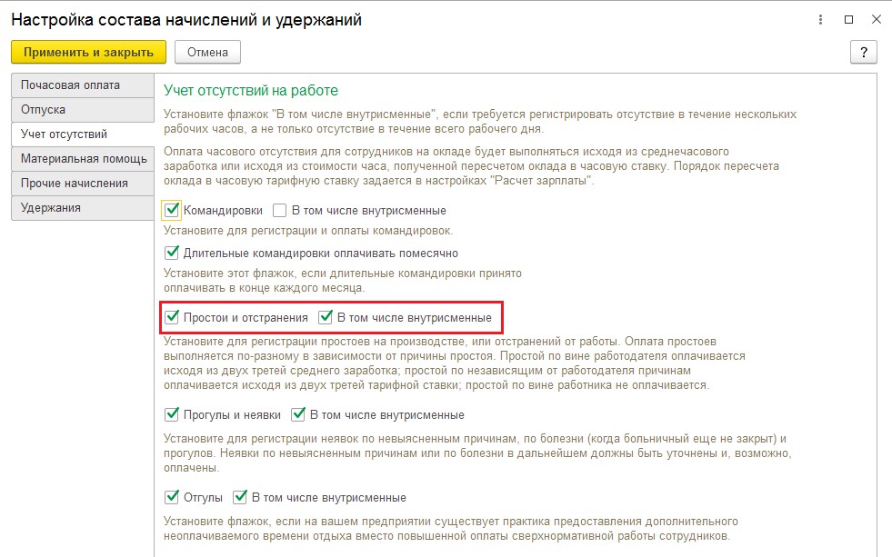 Для отражения простоя в программе предварительно нужно активировать данную функцию. Чтобы это сделать, нужно перейти в раздел "Настройка". Далее требуется найти и выбрать "Расчет зарплаты". После того, как открылось новое окно, в нем следует выбрать ссылку "Настройка состава начислений и удержаний" и перейти по ней. В появившейся вкладке "Учет отсутствий" нужно поставить флажок "Простои и отстранения". Если вам требуется отразить почасовой, а не целодневный простой, то дополнительно надо поставить флажок "В том числе внутрисменные".