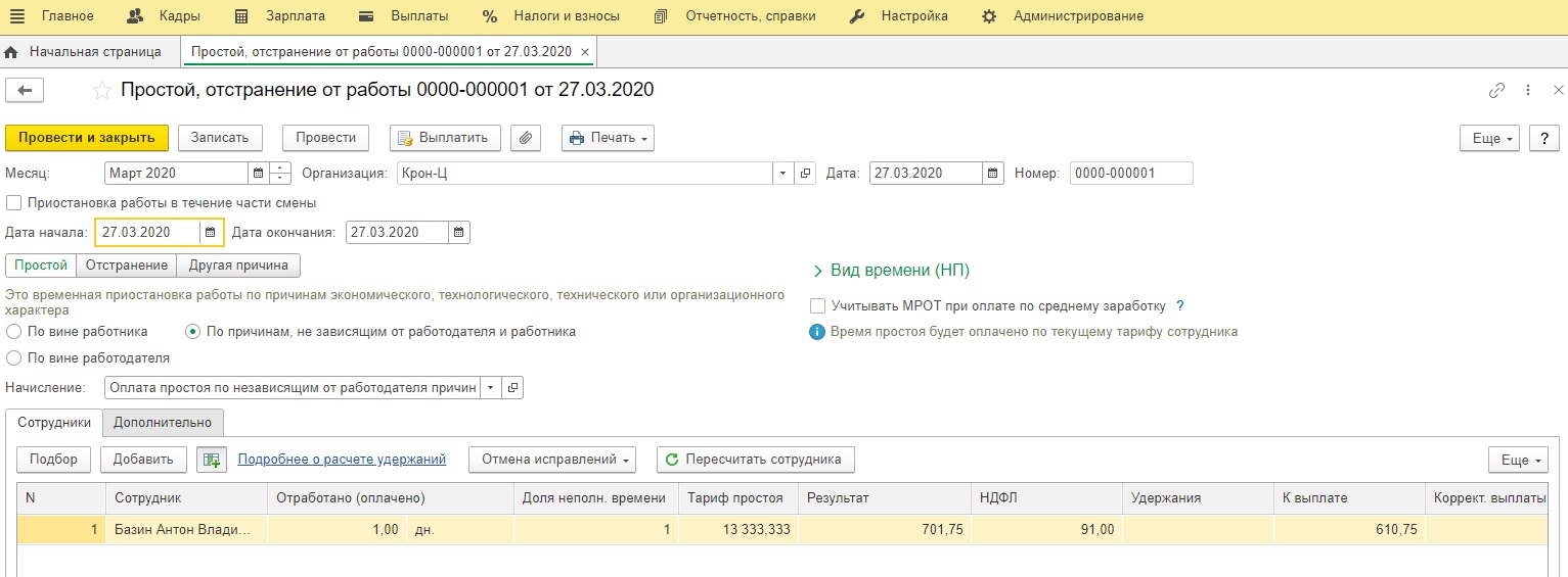 Отражение простоя в 1С: ЗУП и 1С: Бухгалтерии