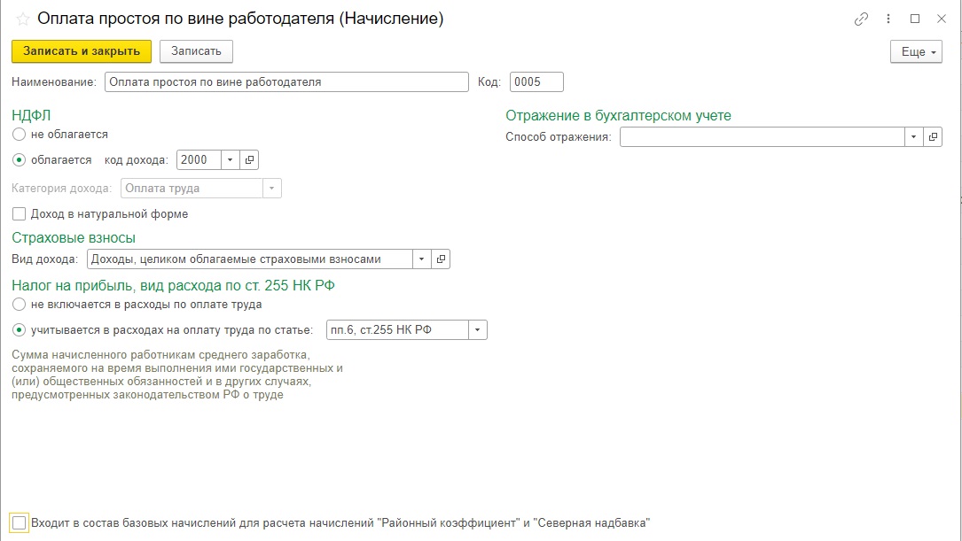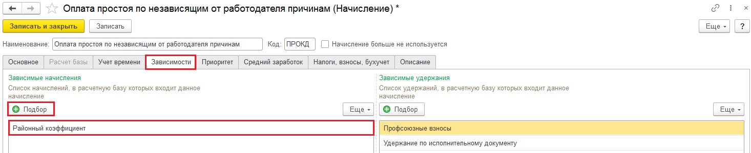 Если в вашем регионе проживания был установлен повышающий коэффициент, то перед проведением начисления следует перейти в раздел "Настройка". После этого там нужно выбрать раздел "Начисления". С помощью поисковой строки следует найти начисления со словом "простой". Далее требуется зайти в необходимый и добавить зависимое начисление "Районный коэффициент".