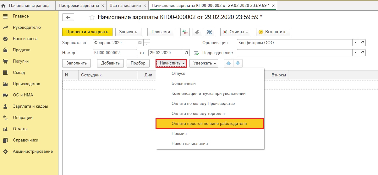 1. По кнопке "Начислить" нужно выбрать начисление "Оплата простоя" и вписать требуемую сумму.