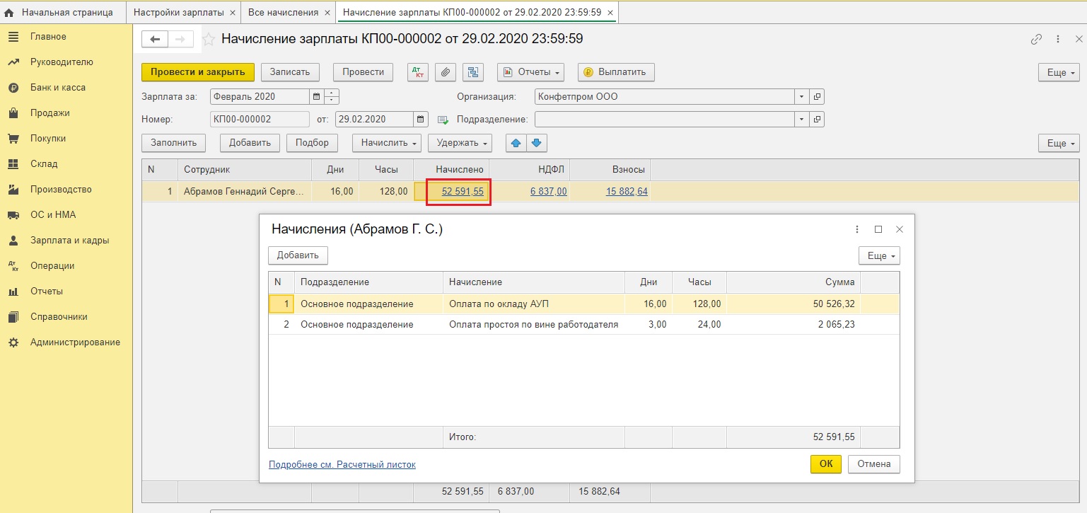 Далее переходим в раздел "Зарплата" и выбираем "Все начисления". Здесь с помощью клавиши "Создать" из меню необходимо выбрать опцию "Простой, отстранение от работы". После того, как документ был создан, нужно указать в нем месяц начисления, а также сроки простоя. Дополнительно следует обозначить, по чьей вине произошел простой и заполнить оставшуюся часть таблицы. В нее нужно вписать имена сотрудников. После этого в колонке под названием "Результат" автоматически должна рассчитаться точная сумма начисления. Подробные результаты можно посмотреть после нажатия на соответствующий значок.