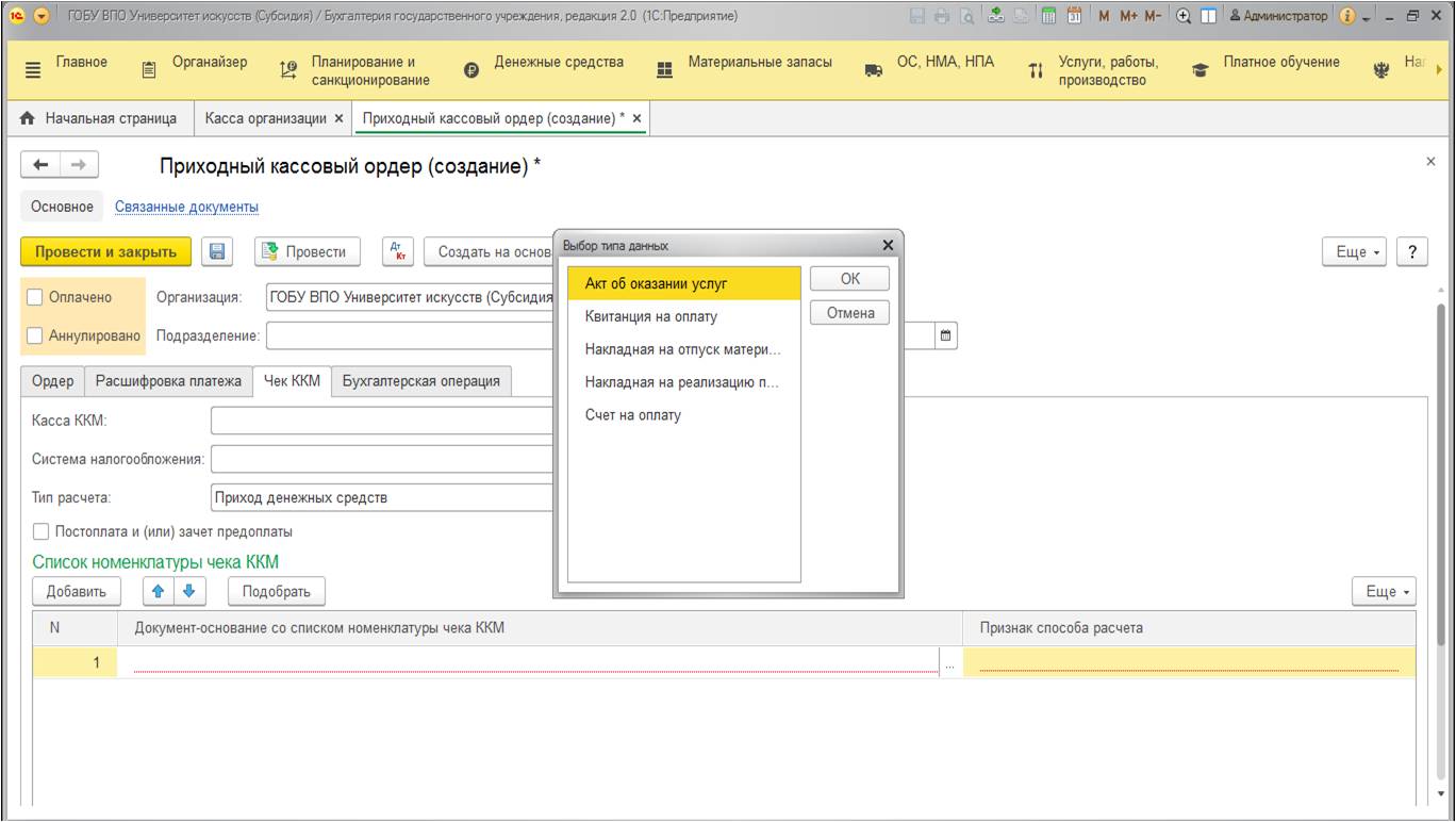 У этой формы есть табличная часть, которая называется "Список номенклатуры чека КММ". Здесь следует подобрать основание, в котором перечислены все реализуемые номенклатурные позиции. В 1С установили несколько определенных типов документов, которые можно указывать в табличной части.