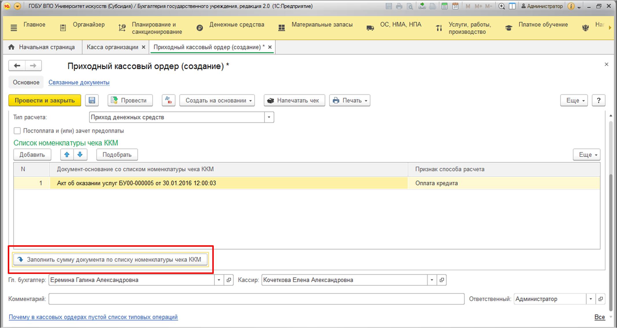 Ниже под табличной частью есть удобная кнопка. С помощью нее возможно заполнить сумму приходного ордера. Для этого не придется даже смотреть сам документ.
