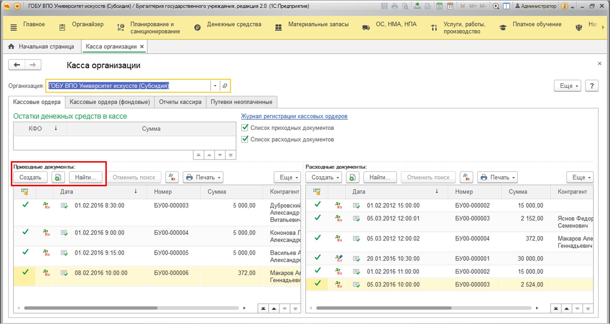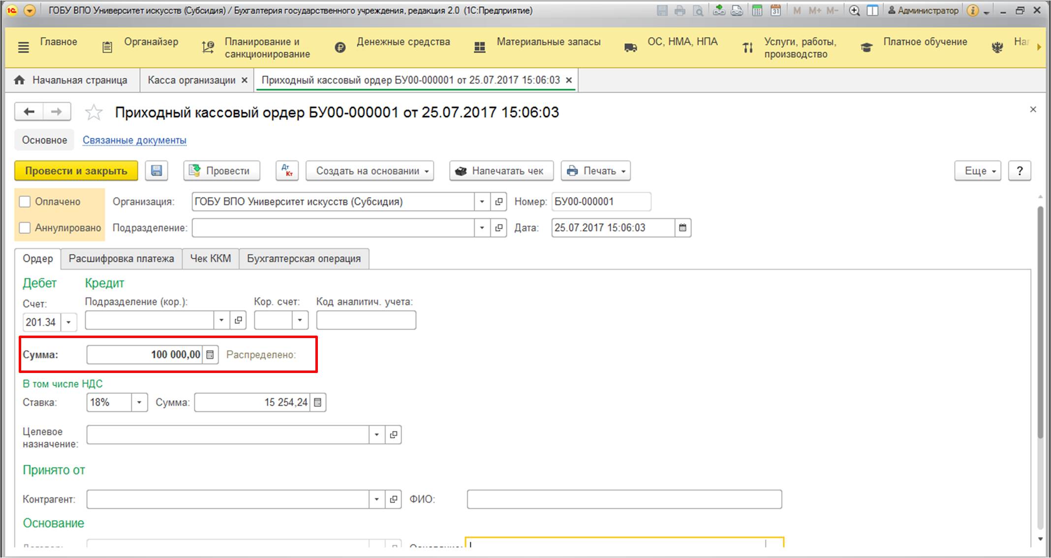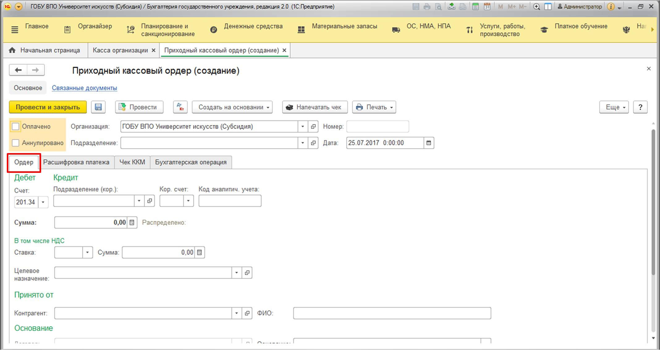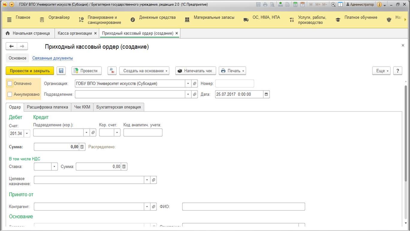 - Воспользуйтесь "Приходным кассовым ордером" и измените его заполнение.