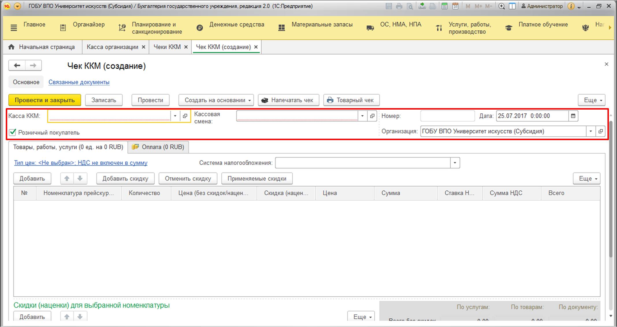 В первую очередь рассмотрим заполнение приходного кассового ордера для печати чека, содержащего несколько позиций. Для этого выберите в документе вкладку "Чек КММ". В этой вкладке следует заполнить реквизиты шапки.