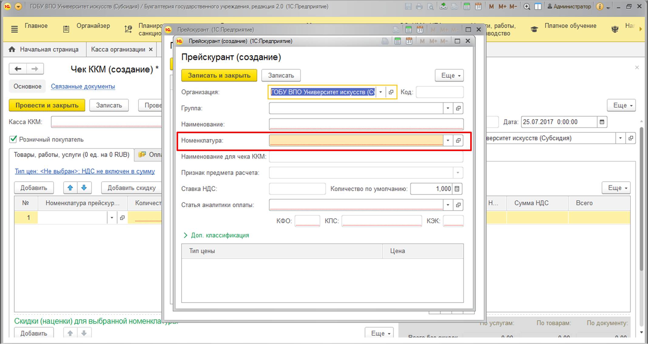 Ниже представлена таблица, в которой необходимо указать номенклатурные позиции. Единственное отличие заключается в том, что их придется выбирать из справочника "Прейскурант".