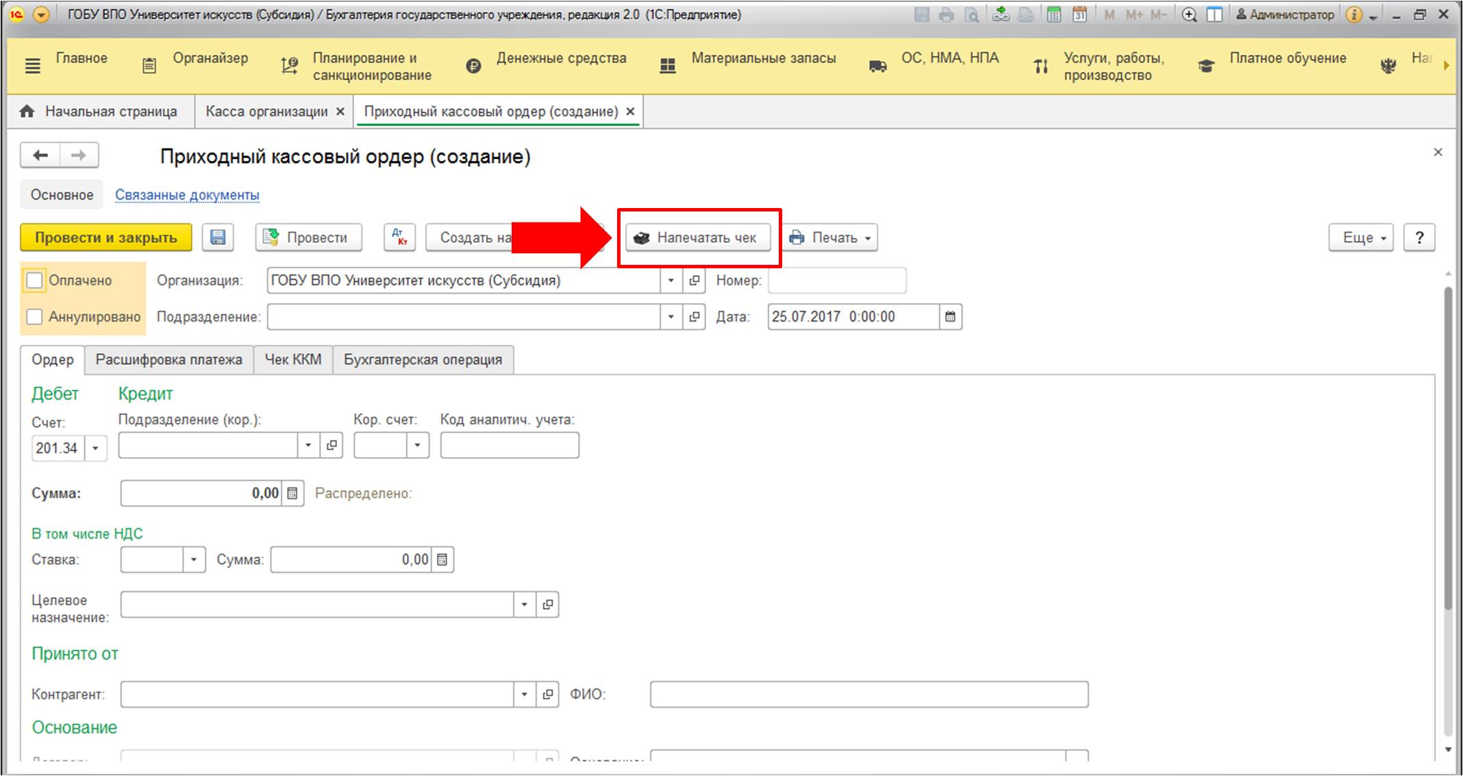 Кроме того, печатать чеки можно из следующих документов: "Эквайринговая операция", "Расходный кассовый ордер". В данной статье будет рассмотрено отражение приходных операций. Вы узнаете, как оформлять документы на поступление средств. Печать чеков осуществляется по кнопке:
