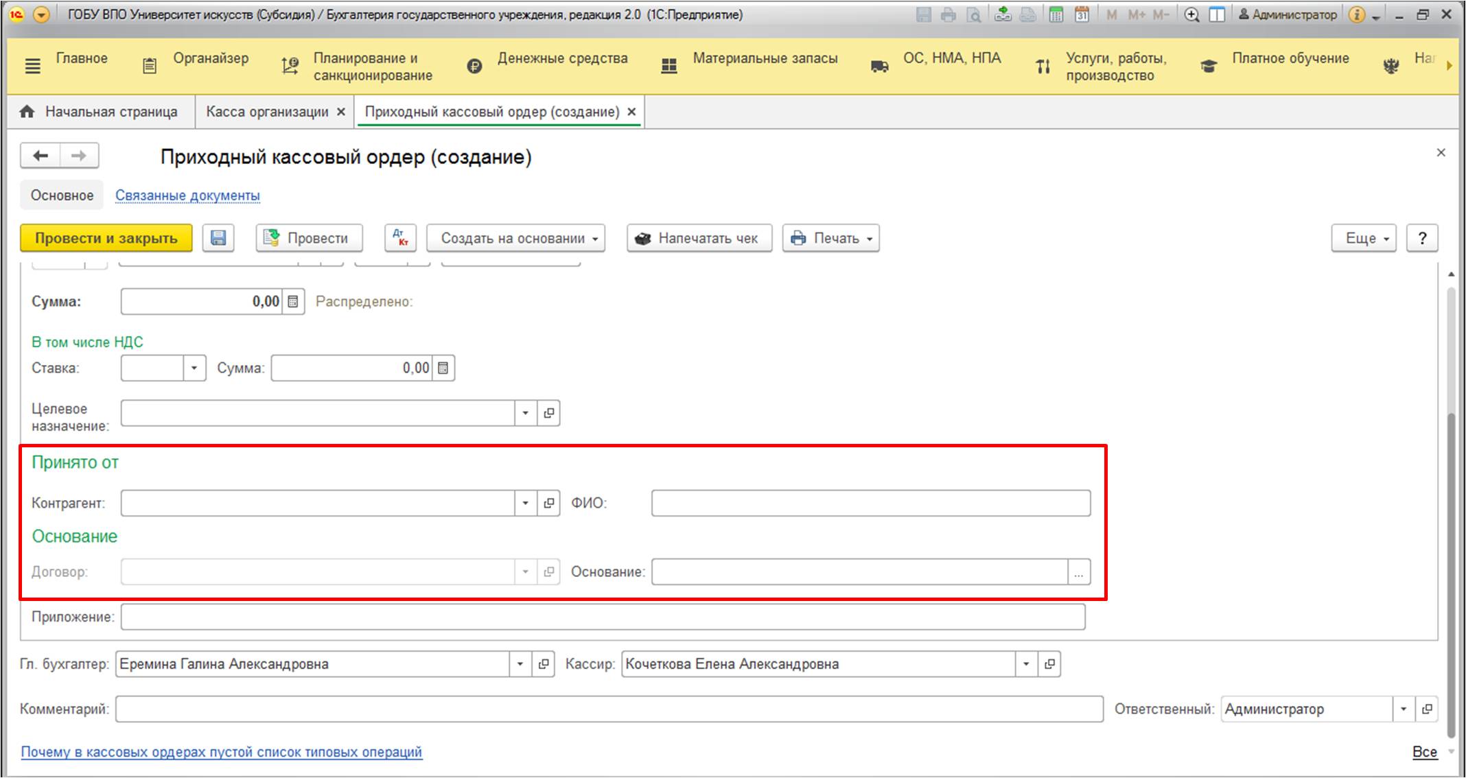 Обратите внимание на раздел "Принято от". В нем можно указать контрагента (с записью в справочник, если это постоянный клиент). У вас есть возможность обойтись обычной строковой записью (если вы заключаете сделку с частным лицом).