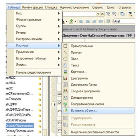 Мы разобрали возможности встроенных функций программы, но также можно самостоятельно создавать шаблоны печатных форм с помощью штрихкода. Для этого в конфигураторе следует открыть шаблон печатной формы желаемого документа и перейти в разделы «Таблица - Рисунок - Вставить объект».