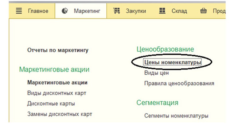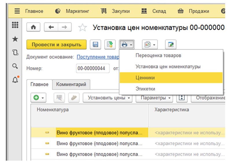 Для примера печати штрихкода возьмем «1С:Розница». Зайдем в раздел «Цены номенклатуры» и просмотрим вывод на печать ценников товаров, чья цена уже установлена.