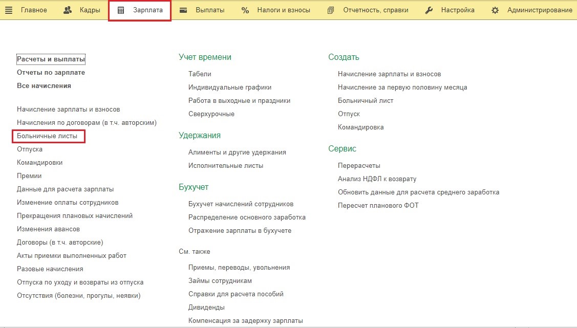 Для внесения информации по больничному листу в 1С: ЗУП нужно во вкладке "Зарплата" зайти в раздел "Больничные листы".